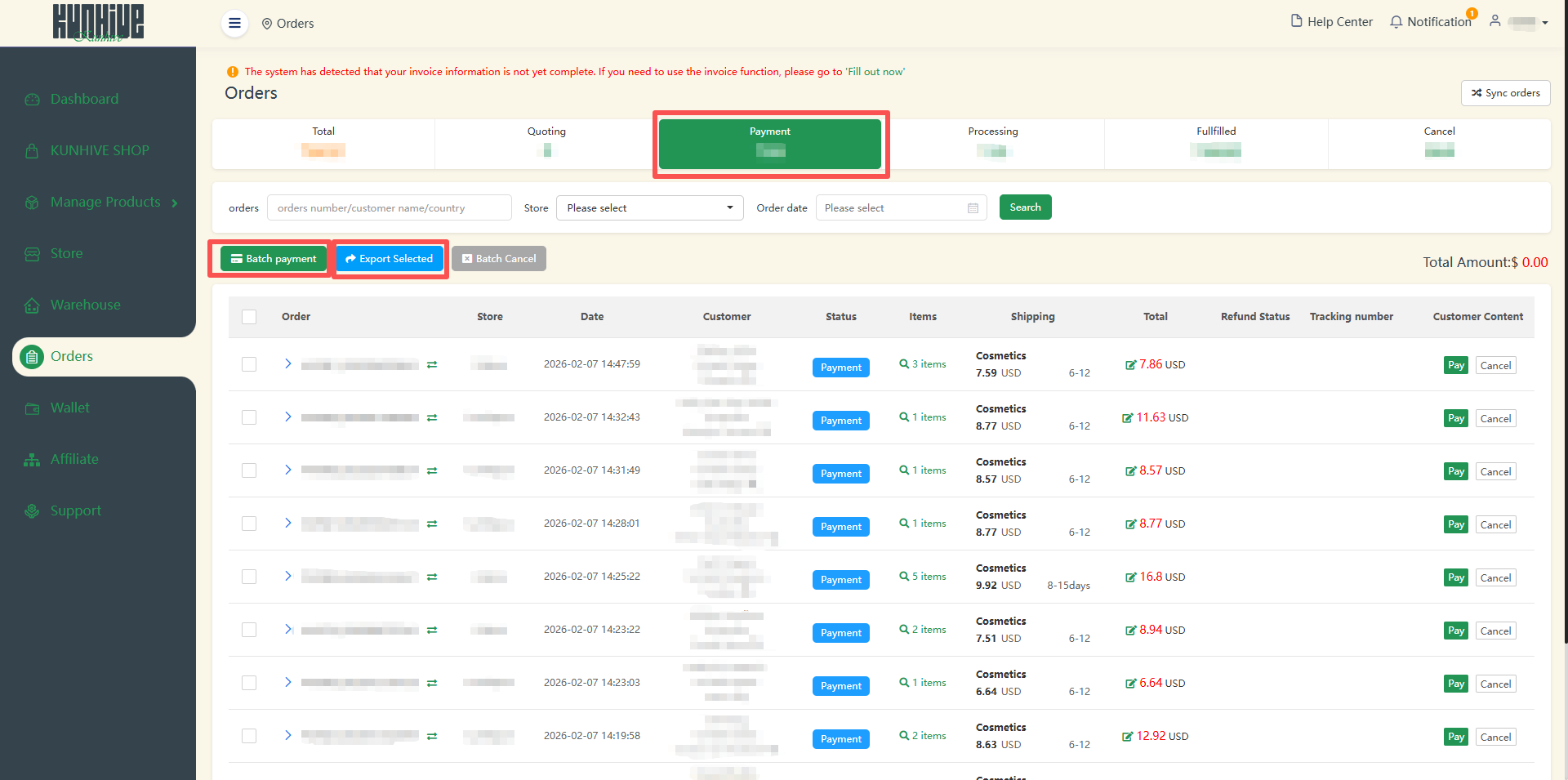 On the ‘Payment’ page, there is an additional ‘Pay’ option. You can pay for your order all at once, or you can choose ‘Batch Payment’ to selectively pay for the orders you want to pay for. Click ‘Export Selected’ to export the data you want to export.