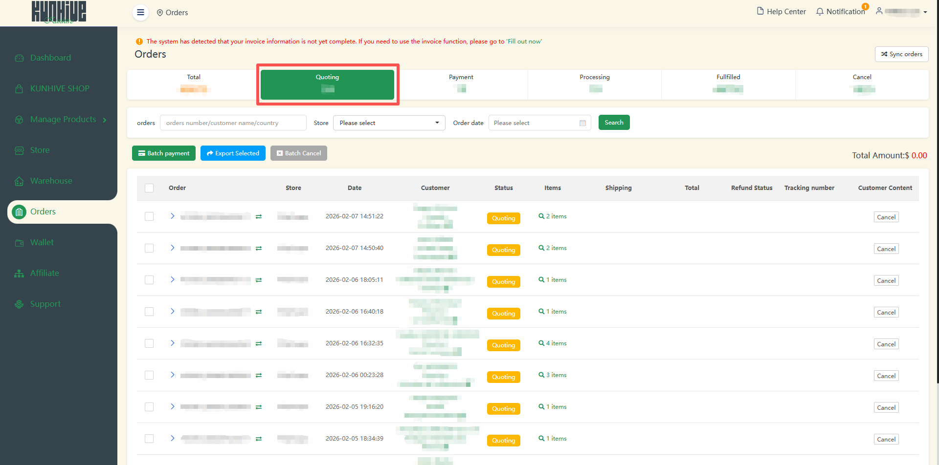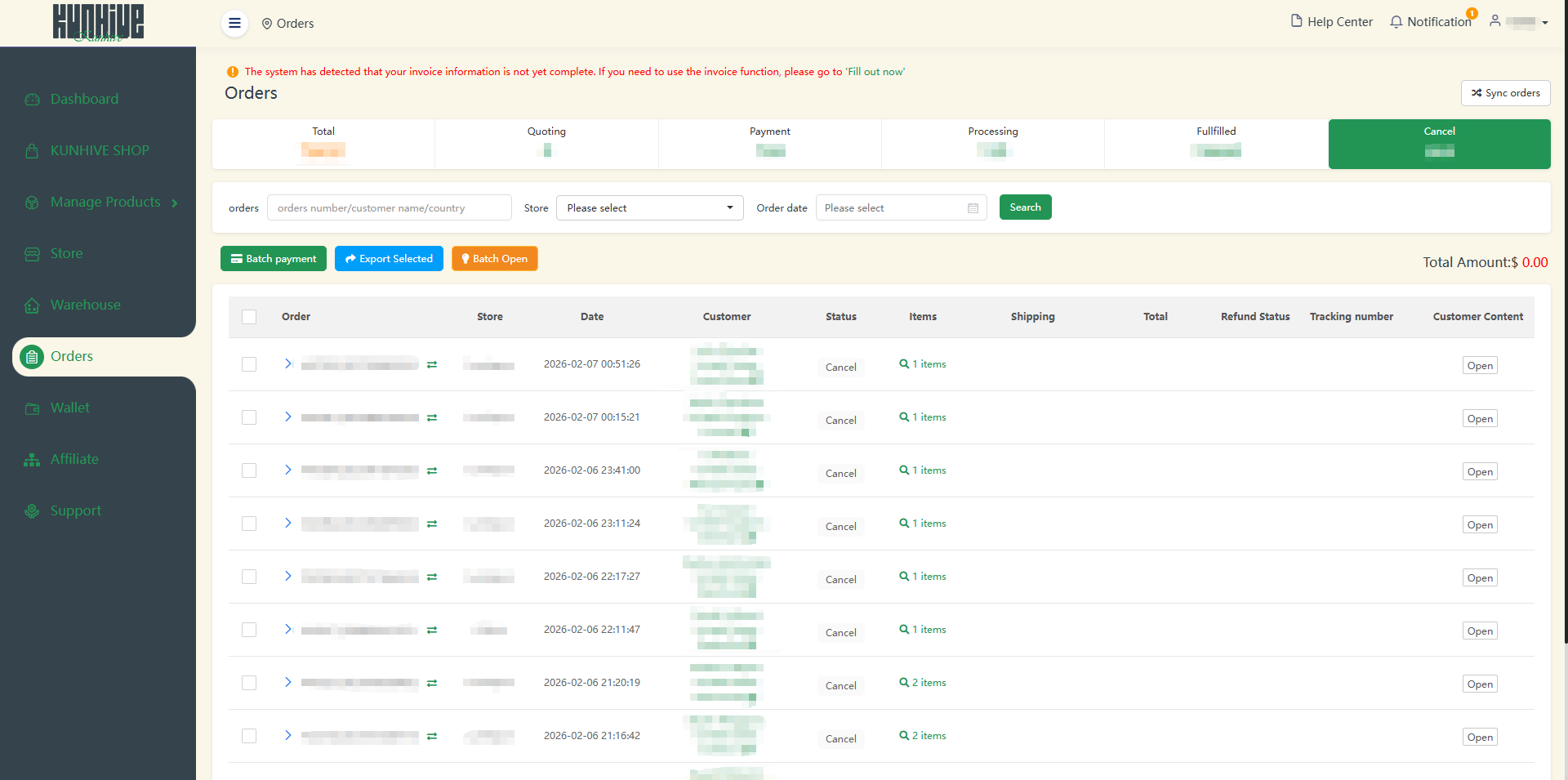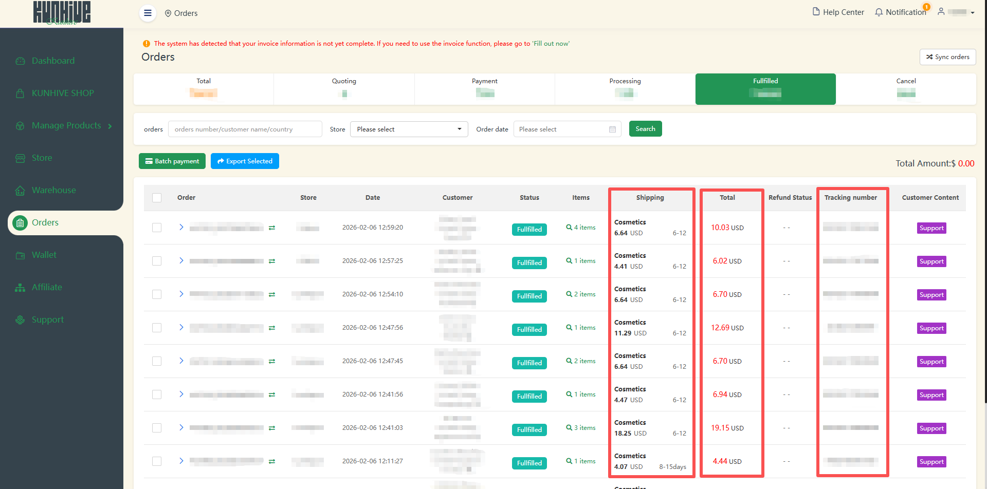 In the “Total” section, you can check the status of all orders. Here you can see the order number, store name, order date, customer address, order status, order quantity, shipping price and time.