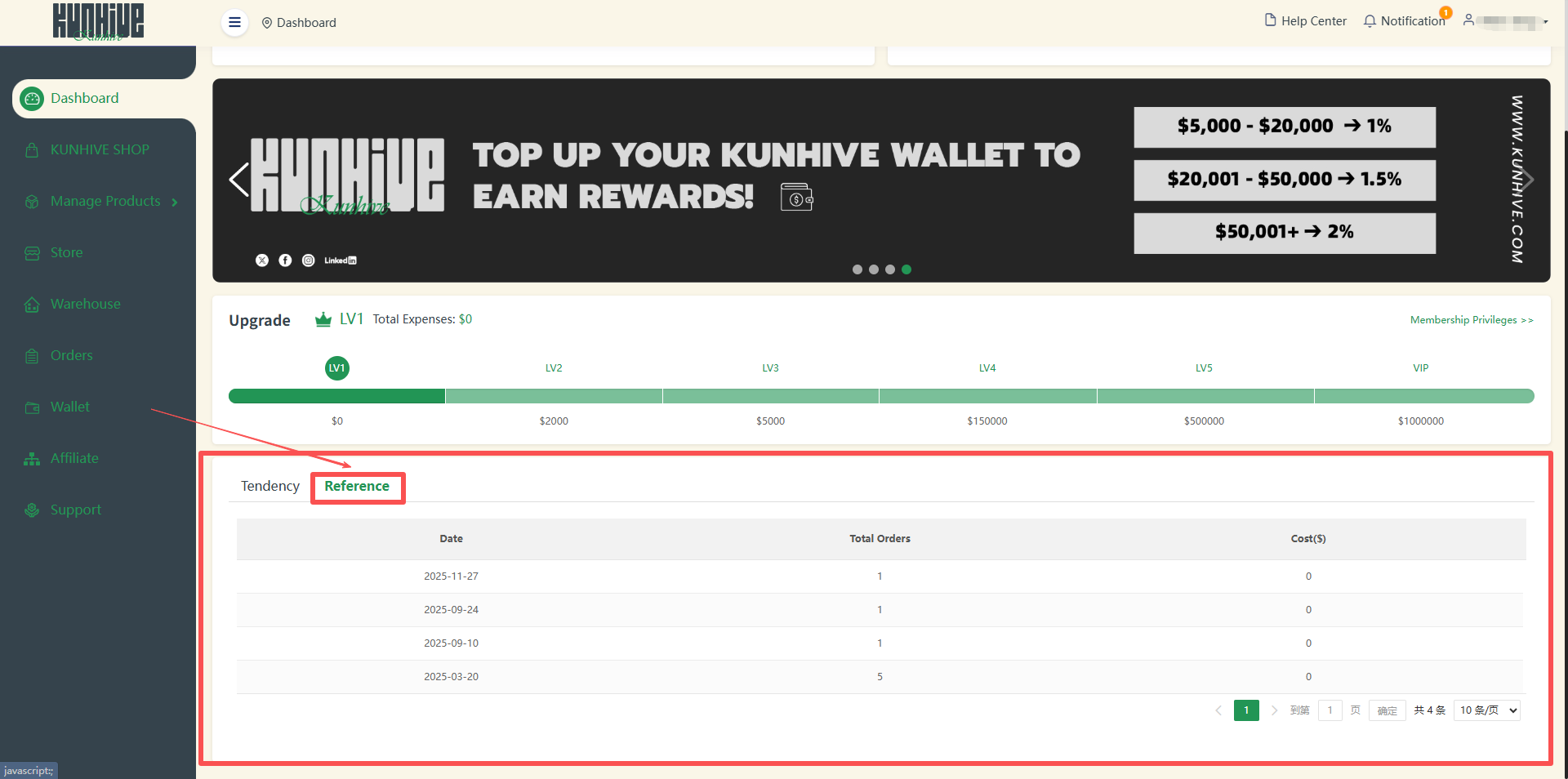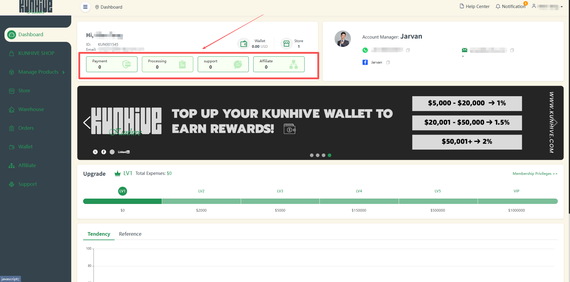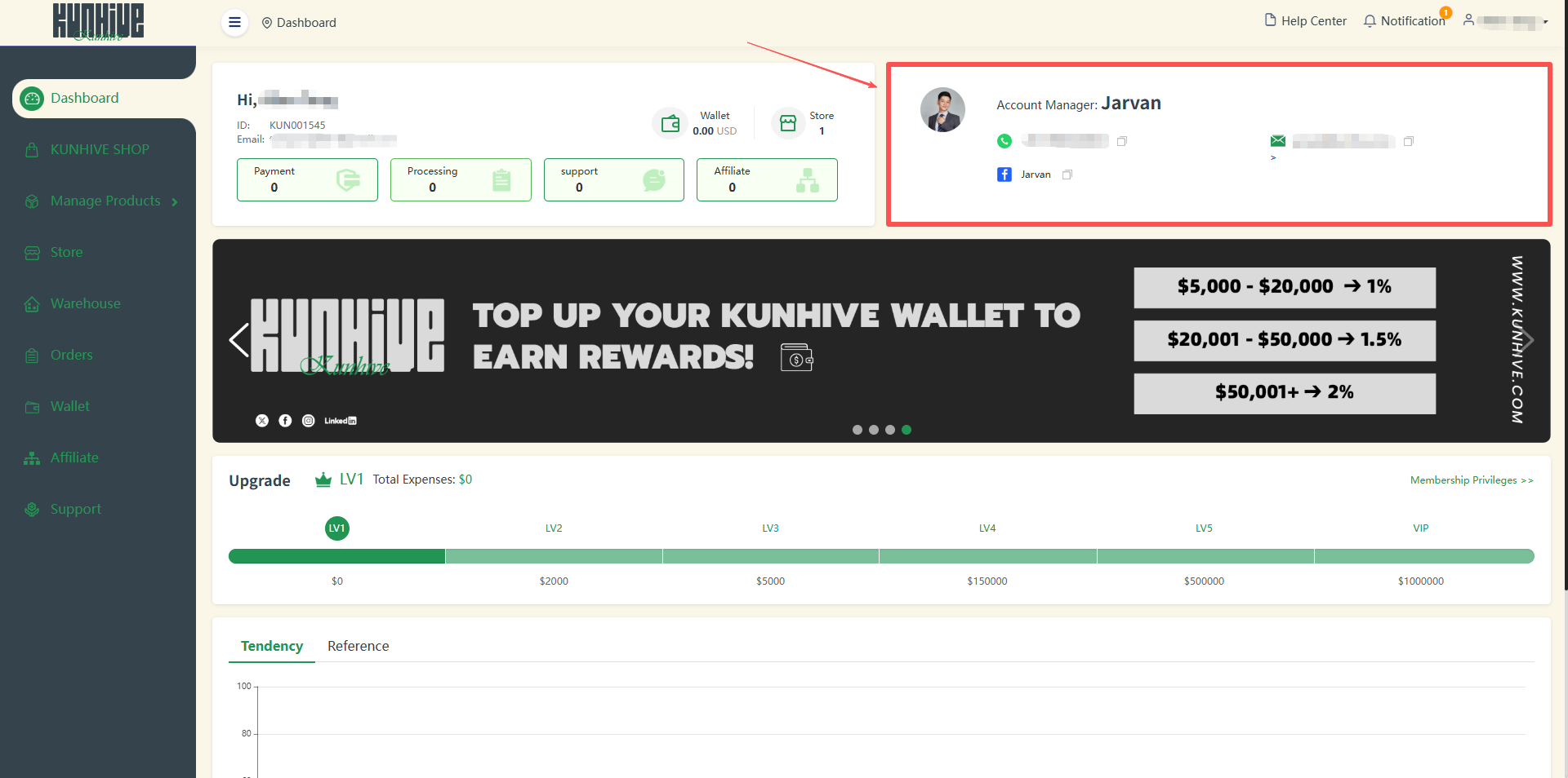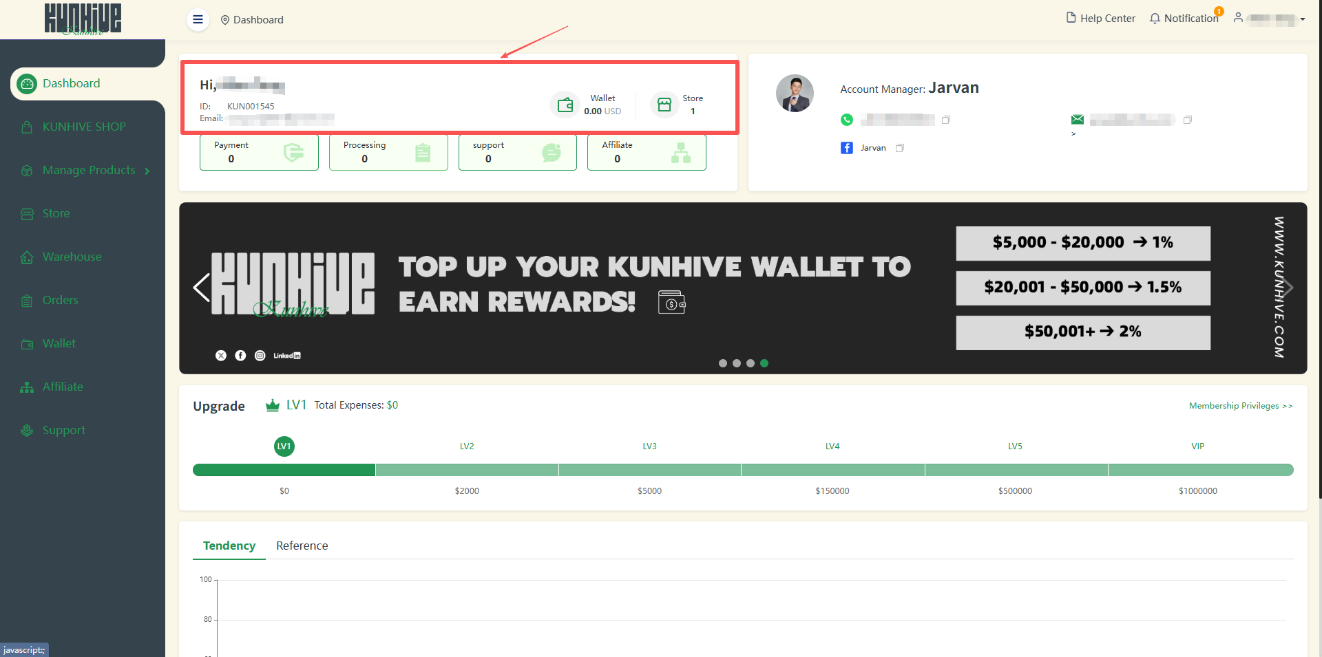 In the upper left corner is some of your basic information as well as some shortcut display and jump interface of KUNHIVE's APP. It includes your name, ID, email, wallet balance and the number of stores bound under your name.