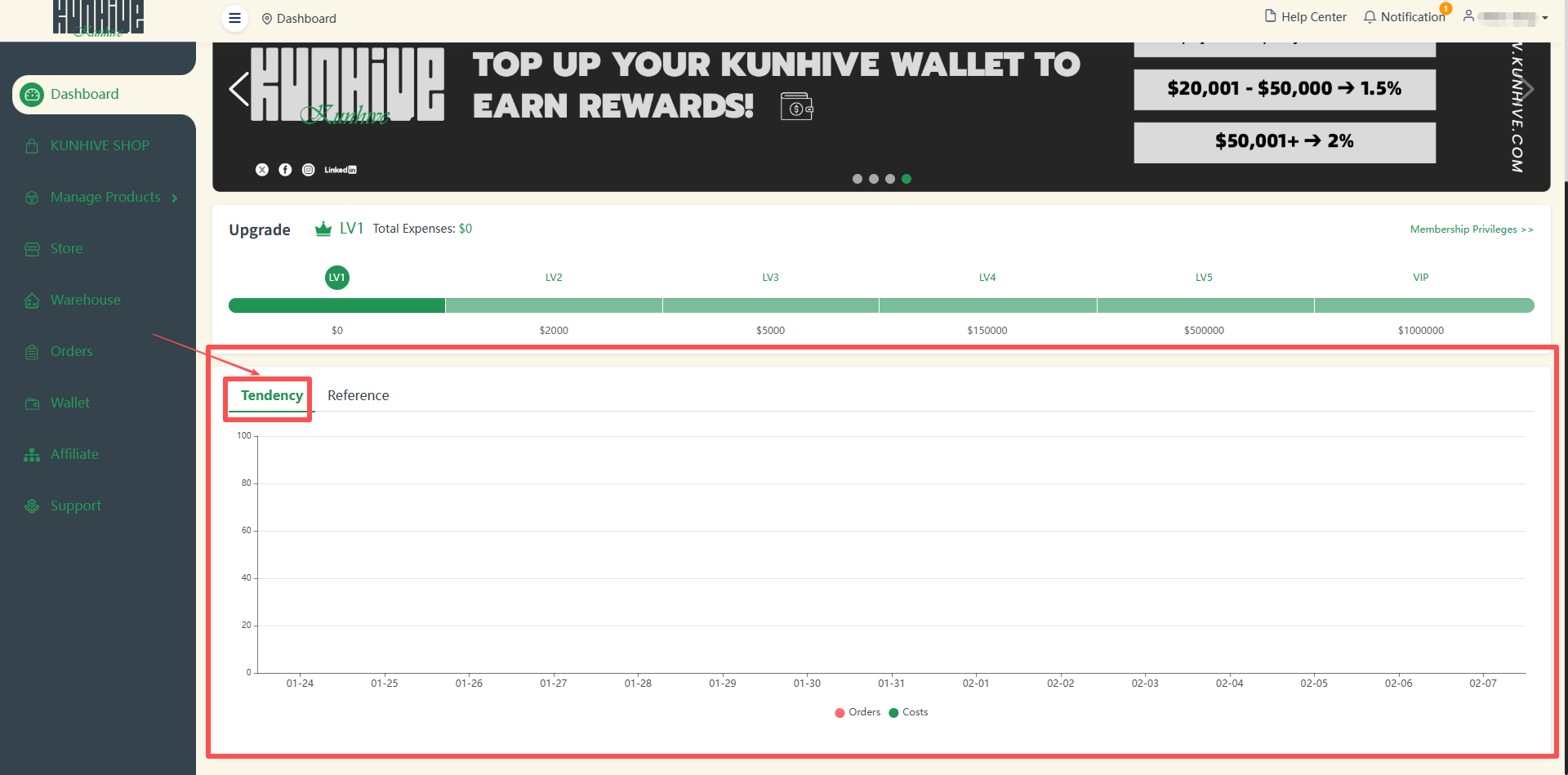 At the bottom it will show the Tendency and Reference for the store you are tied to for the most recent period of time. Tendency displays your recent orders and expenses as a bar chart, and Reference visualizes when the order was generated, the total number of orders, and the total expenses.